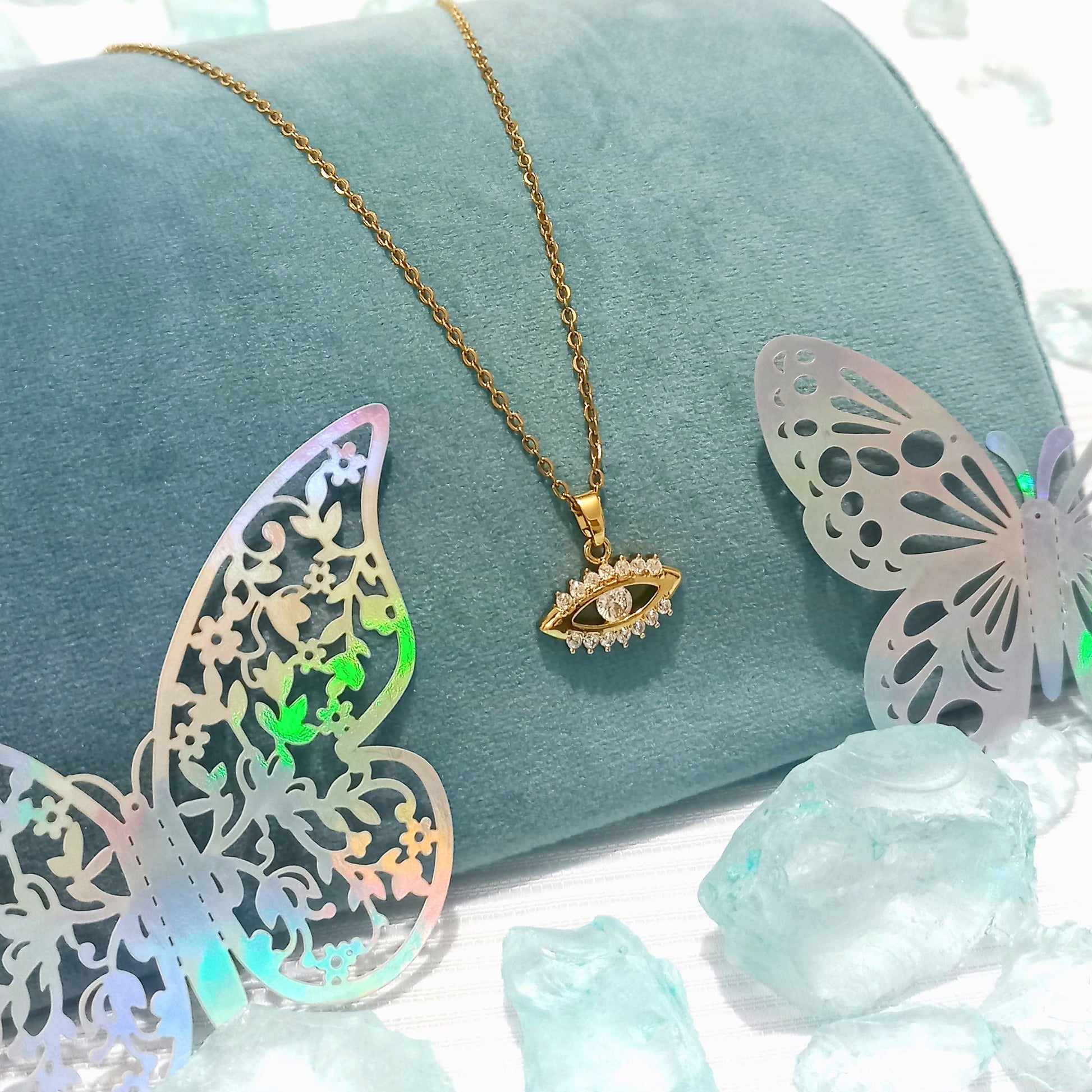 Este collar dorado combina un diseño simbólico y elegante con un delicado dije en forma de ojo protector, realzado con detalles brillantes que capturan la luz desde todos los ángulos. El acabado dorado aporta un toque de calidez y sofisticación, mientras que las incrustaciones simulan cristales, dándole un brillo cautivador que complementa cualquier look.