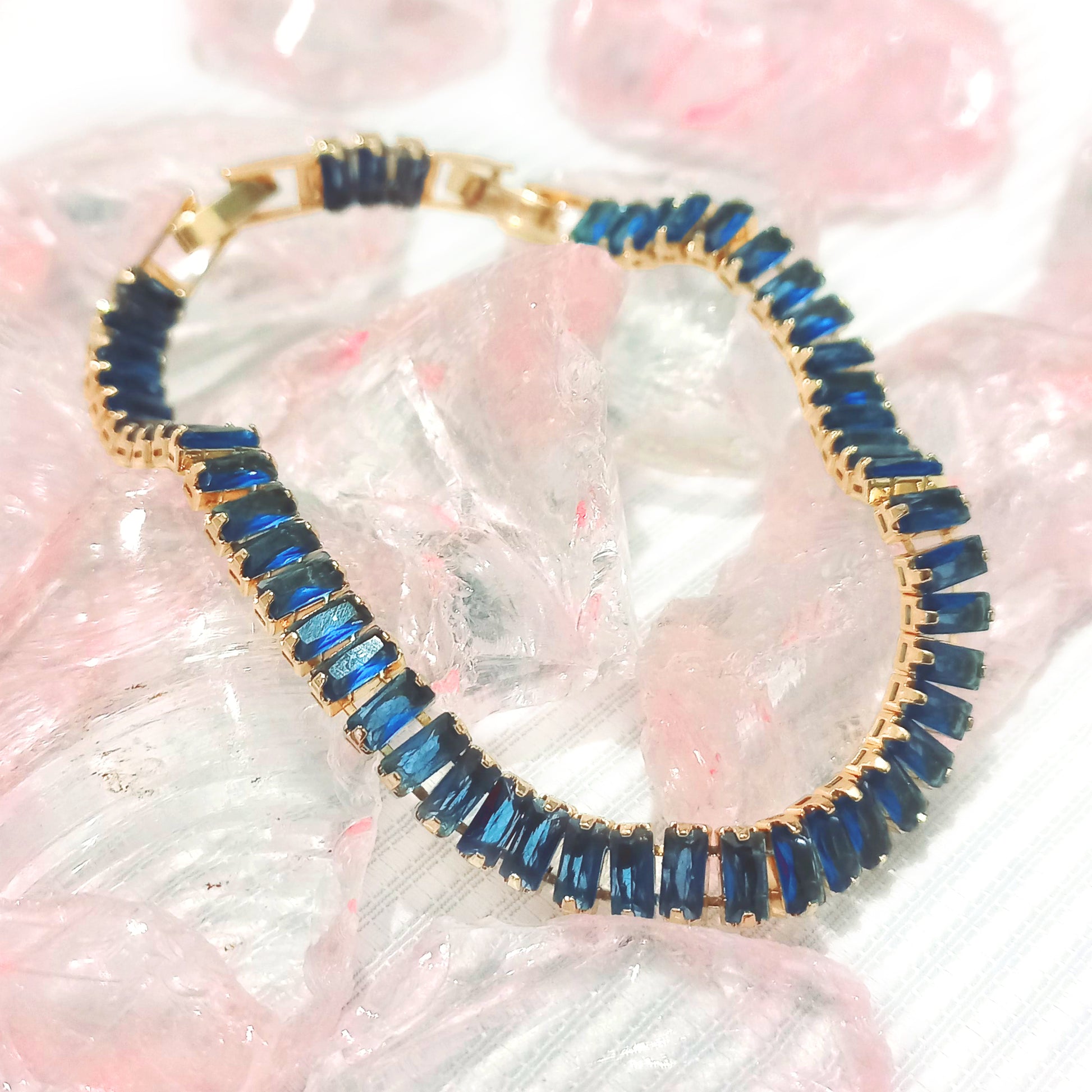 Esta pulsera presenta una fila de piedras de corte baguette en un intenso tono azul zafiro, cuidadosamente engastadas sobre una base dorada que realza su brillo y elegancia. Su diseño sofisticado combina a la perfección modernidad y lujo, haciéndola ideal para destacar en eventos especiales o añadir un toque refinado a tu look diario.